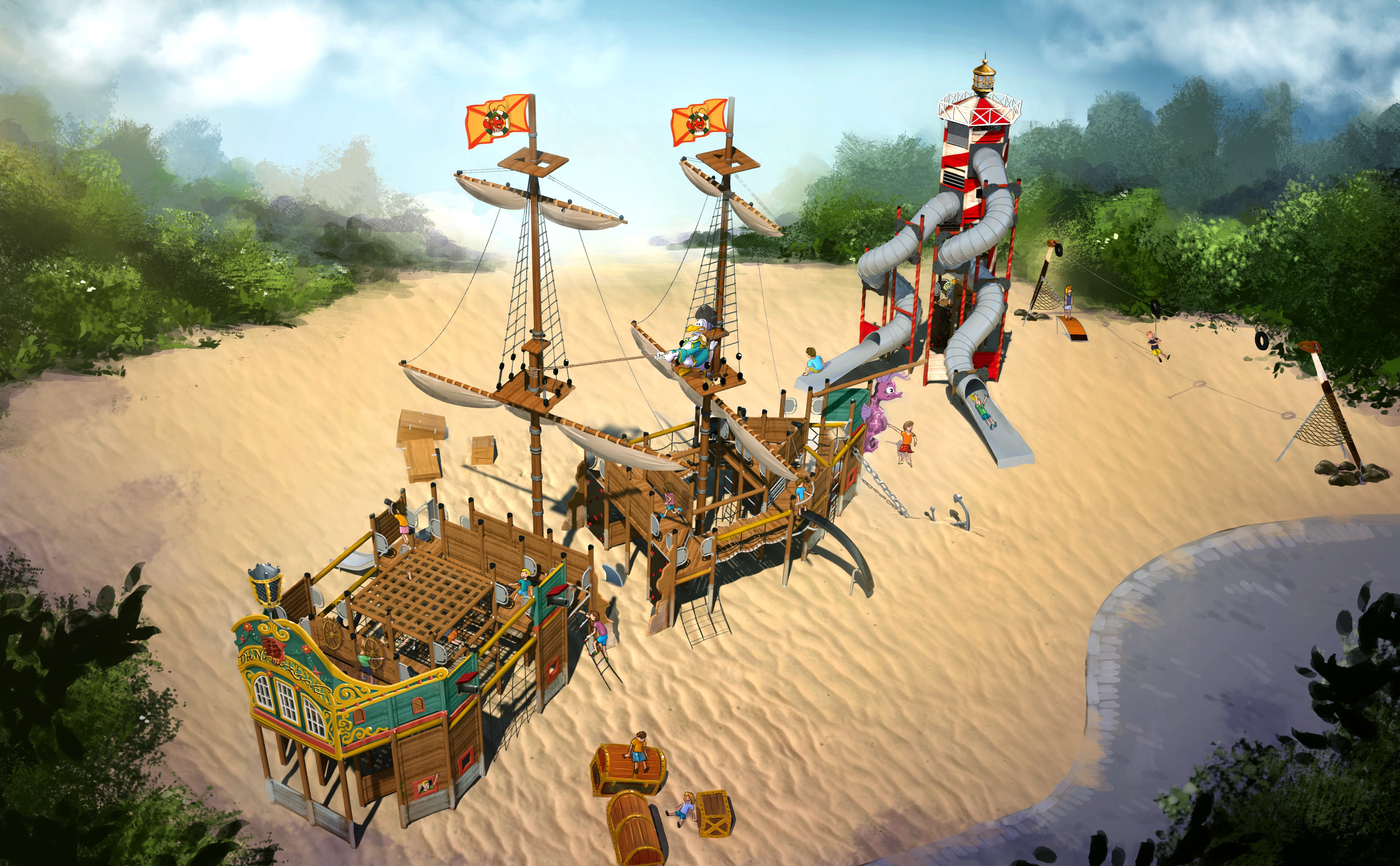 Một dự án khác cũng rất đáng để nhắc đến chính là con tàu hải tặc huy hoàng và kiêu dũng, được đặt hàng bởi một trong những khu cắm trại lớn nhất Hà Lan. Họ đã yêu cầu rất nhiều thiết bị vui chơi giải trí nhưng điều họ thực sự mong muốn đó là tạo nên một trải nghiệm không thể quên với những du khách từng ghé qua nơi này. Hơn nữa, họ vô cùng đề cao chất lượng, cũng như độ bền của thiết bị vui chơi bởi khu vui chơi của họ là điểm đến thường xuyên và lý tưởng của rất nhiều gia đình, mọi cơ sở vật chất tại đây đều phải có đủ chất lượng để chịu được sức nặng của hàng triệu bước chân mỗi ngày.